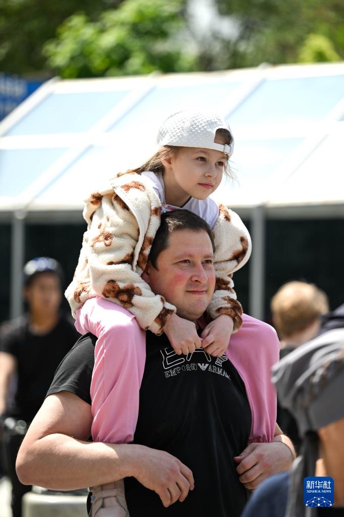 5月1日,在哈萨克斯坦阿拉木图,一名男子带着孩子观看表演。