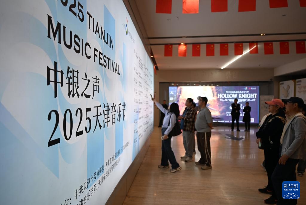5月1日,观众在天津大剧院浏览2025天津音乐节演出场次安排。