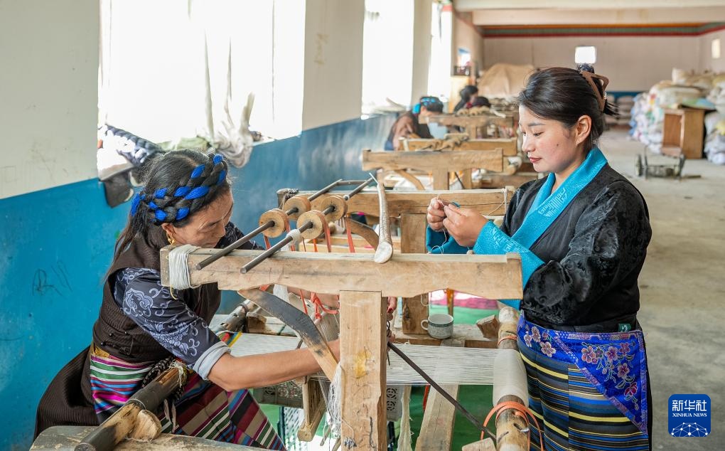 旦增卓嘎(右)和合作社的妇女调整编织机(4月23日摄)。