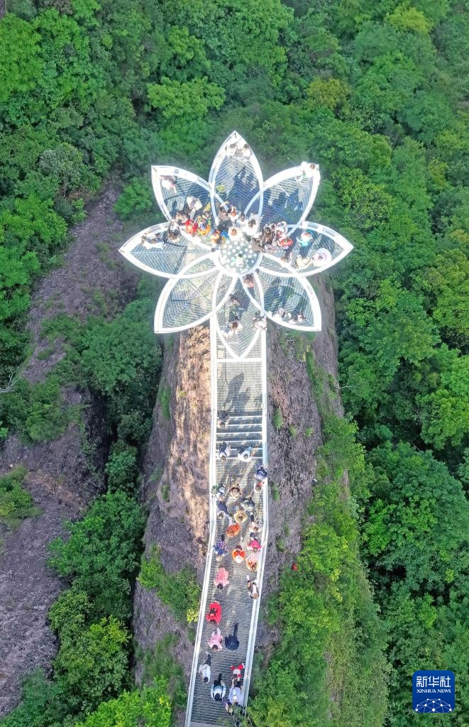 5月2日,游客在浙江省台州市仙居县神仙居景区莲花台上游玩(无人机照片)。