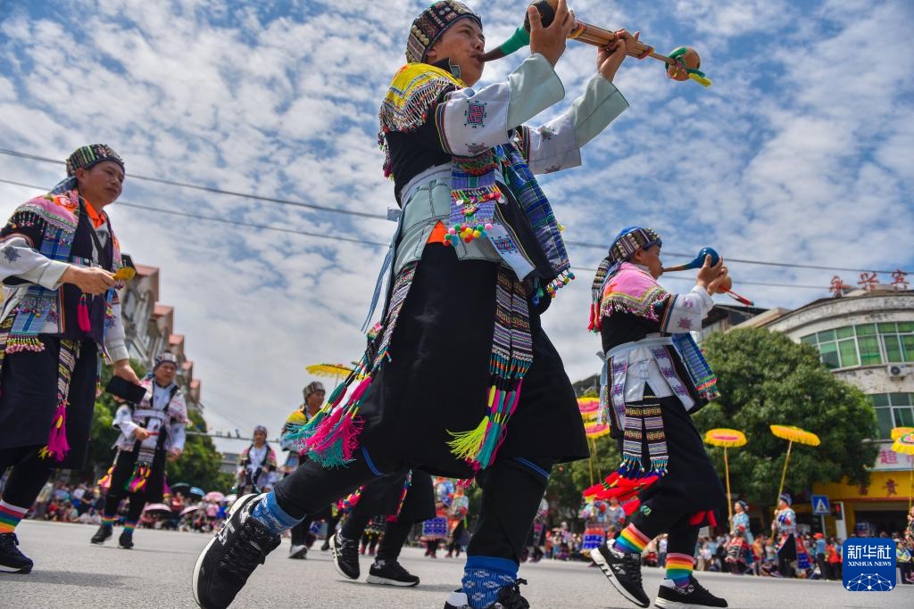 5月1日,在云南省文山壮族苗族自治州富宁县举办的“陇端·坡芽情歌”文化旅游系列活动开街仪式上,群众演员在“闹街”巡演。