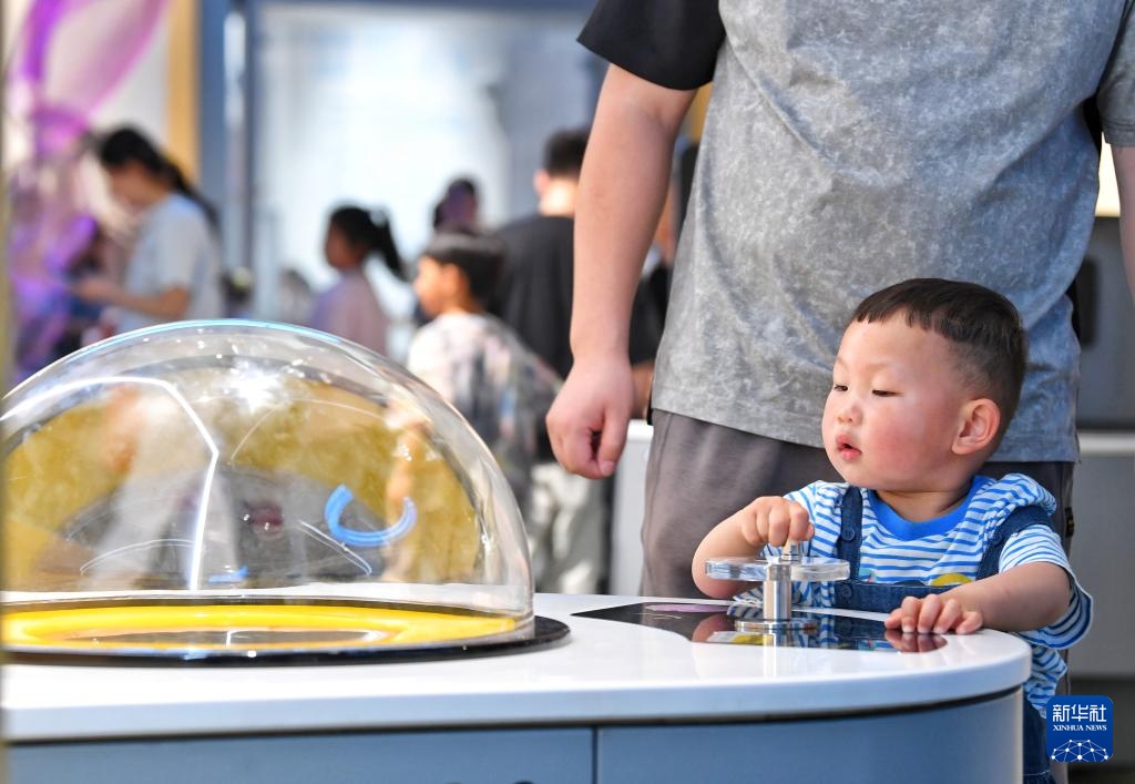 5月2日,在安徽省合肥市科技馆(蜀西湖馆区),小朋友体验操作电磁感应科普设备。