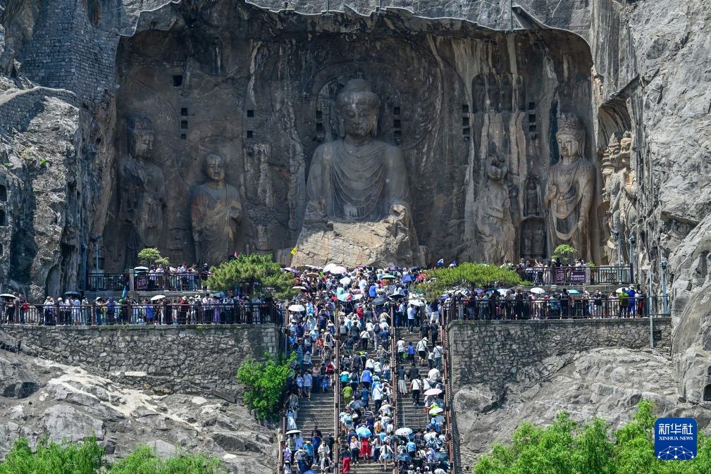 5月2日,游客在河南省洛阳市龙门石窟景区内游览。