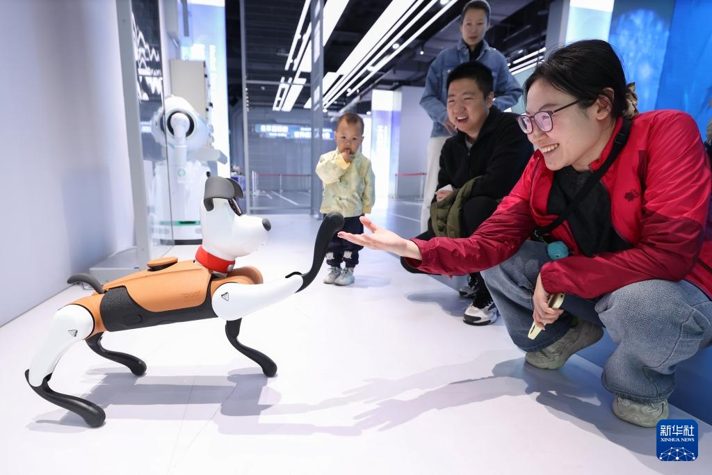 5月2日,在北京市机器人产业园的“机器人大世界”展区,参观者与机器狗“小白”互动。