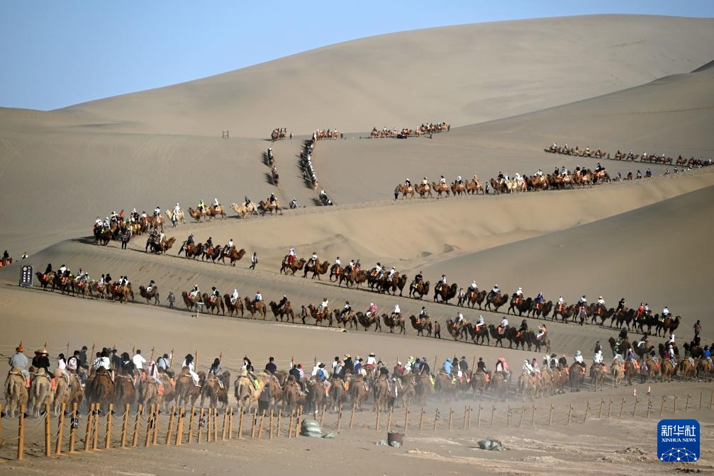 5月1日,游客在甘肃省敦煌市鸣沙山月牙泉景区游览。
