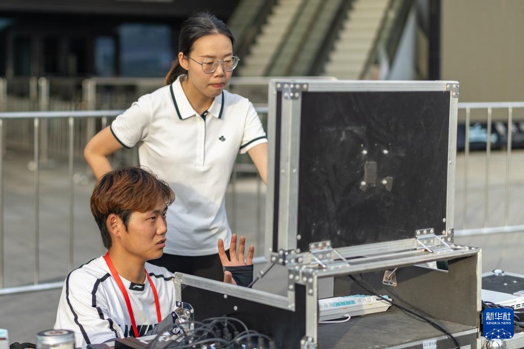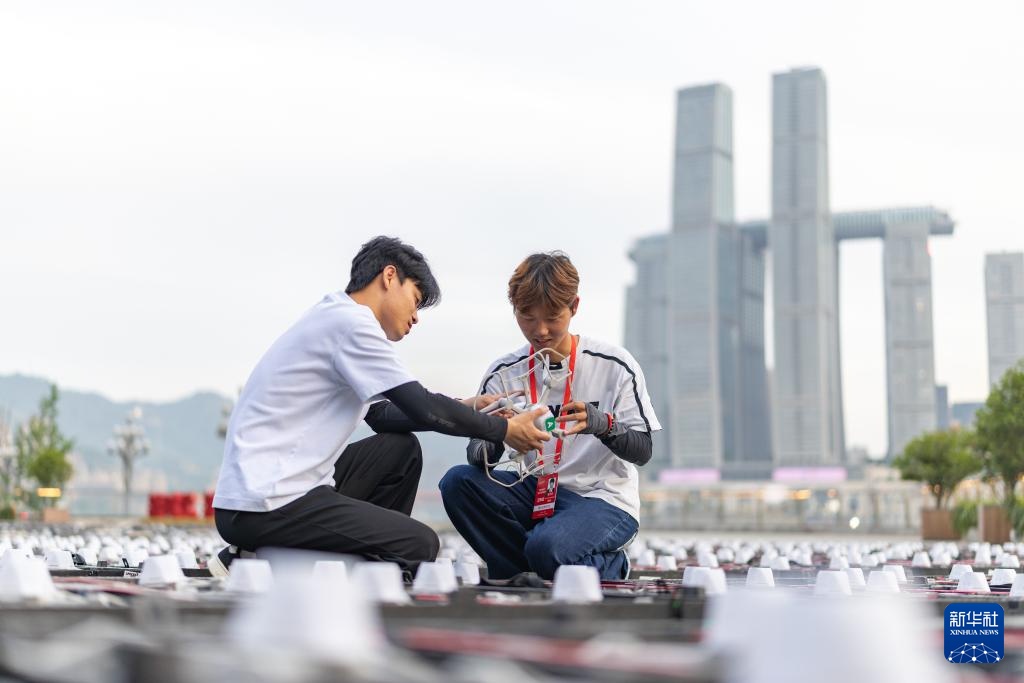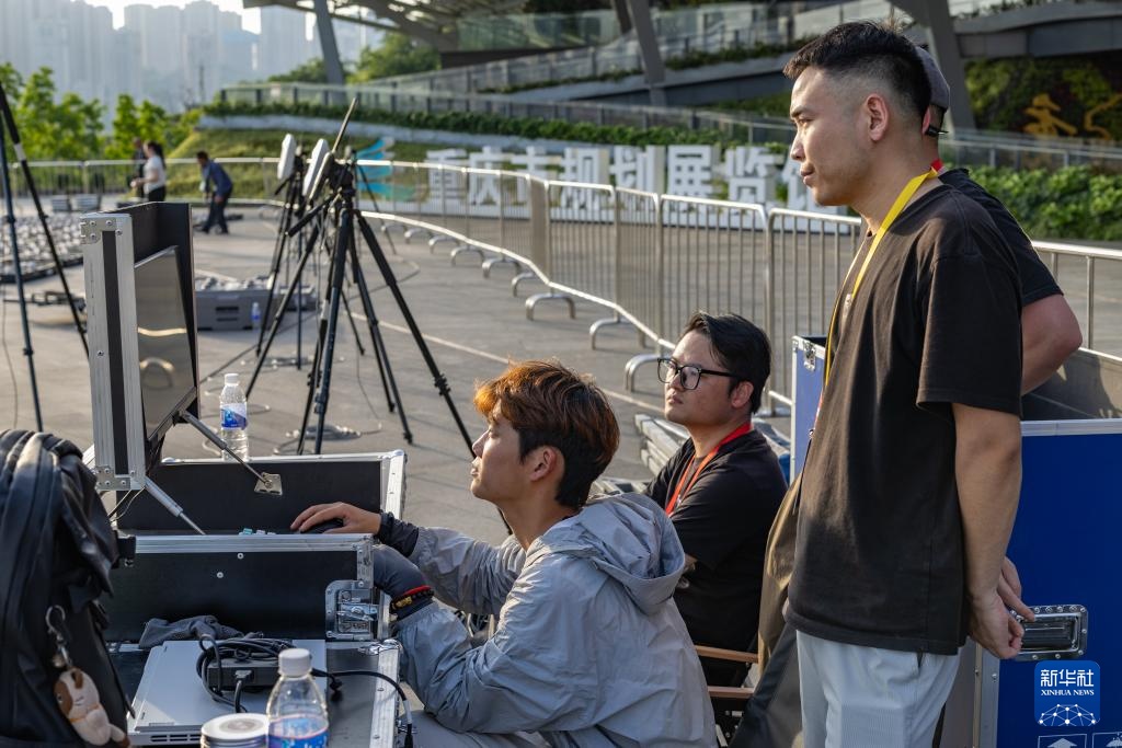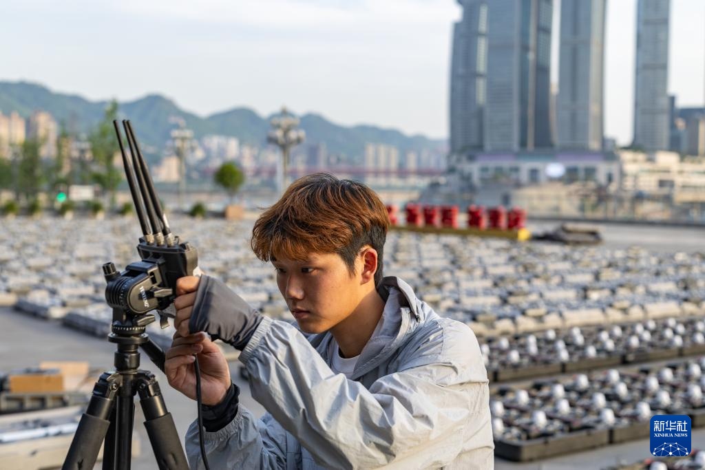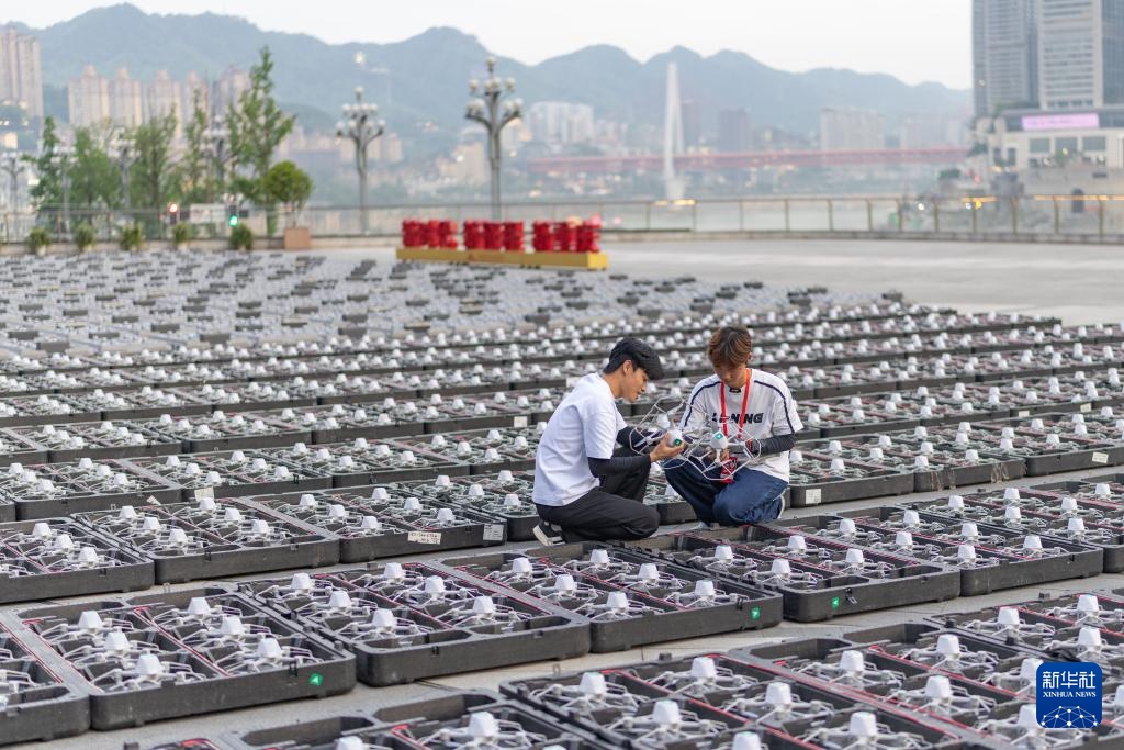 5月1日,在重庆市南岸区,“魅力重庆”常态化无人机灯光秀团队检查无人机状态。