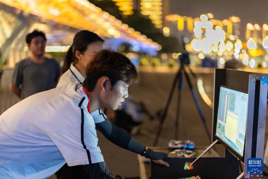 5月1日晚,在重庆市南岸区,“魅力重庆”常态化无人机灯光秀团队成员对无人机进行执飞前检查。