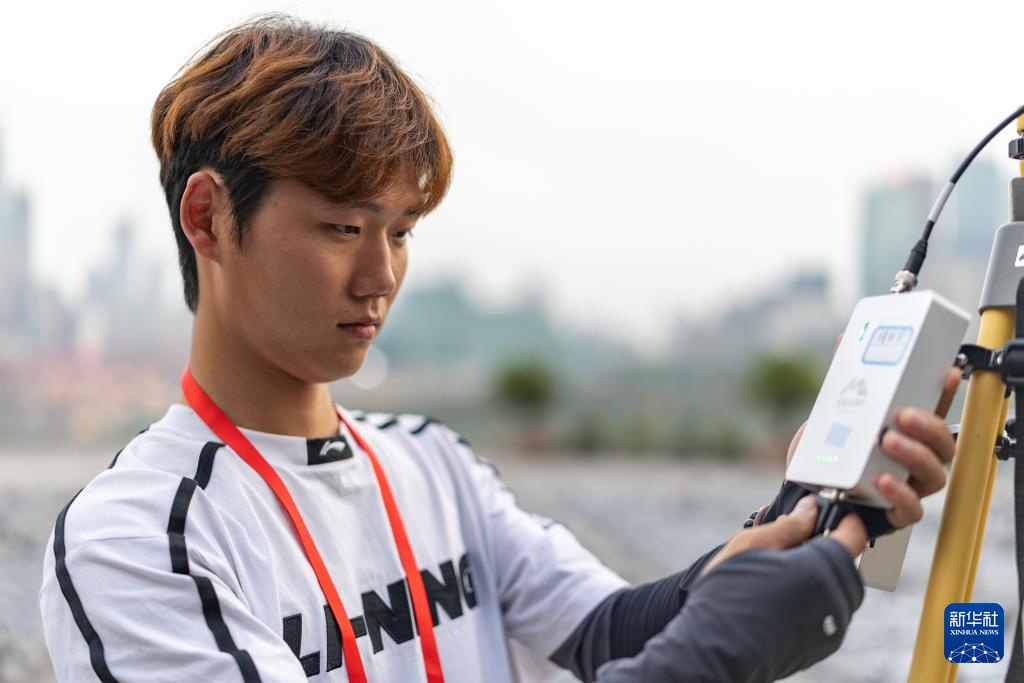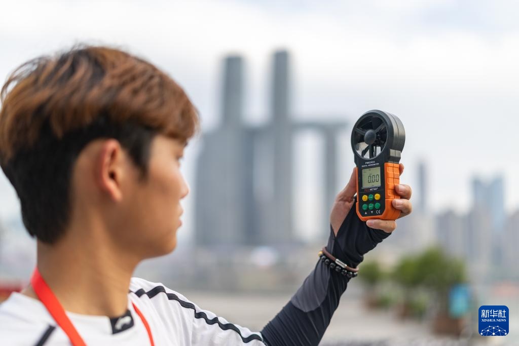 5月2日,在重庆市南岸区,陆子祥在检测无人机起飞场地风速情况。