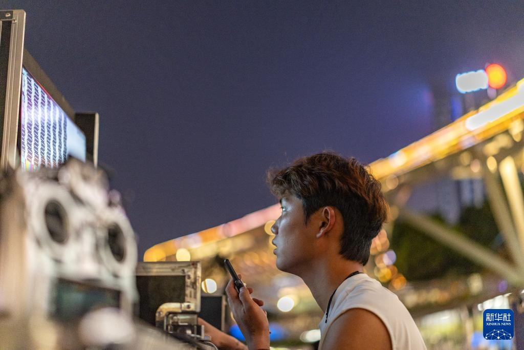 5月1日晚,在重庆市南岸区,陆子祥在执行当天展演任务后检查无人机状态。