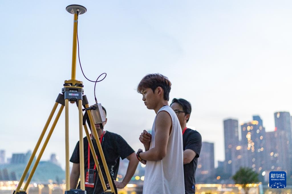 5月1日,在重庆市南岸区,陆子祥(左一)带领“魅力重庆”常态化无人机灯光秀团队检查飞行系统状态。