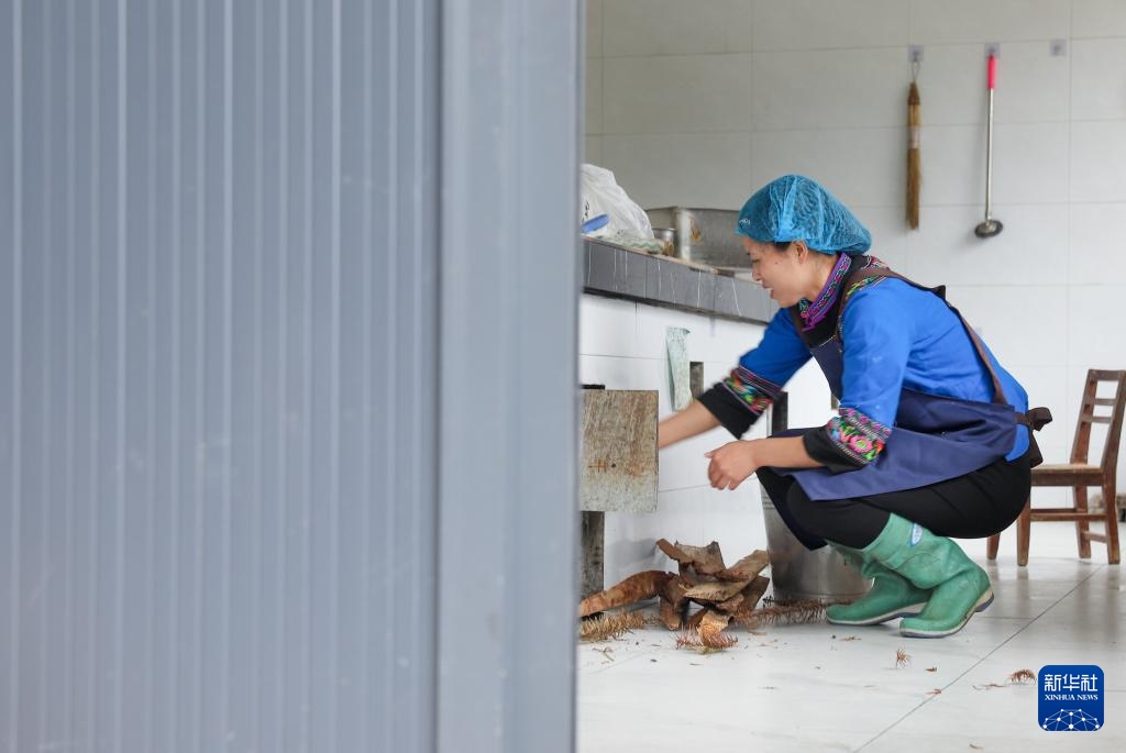4月25日,在作坊内,陈星星添加柴火煮豆浆。