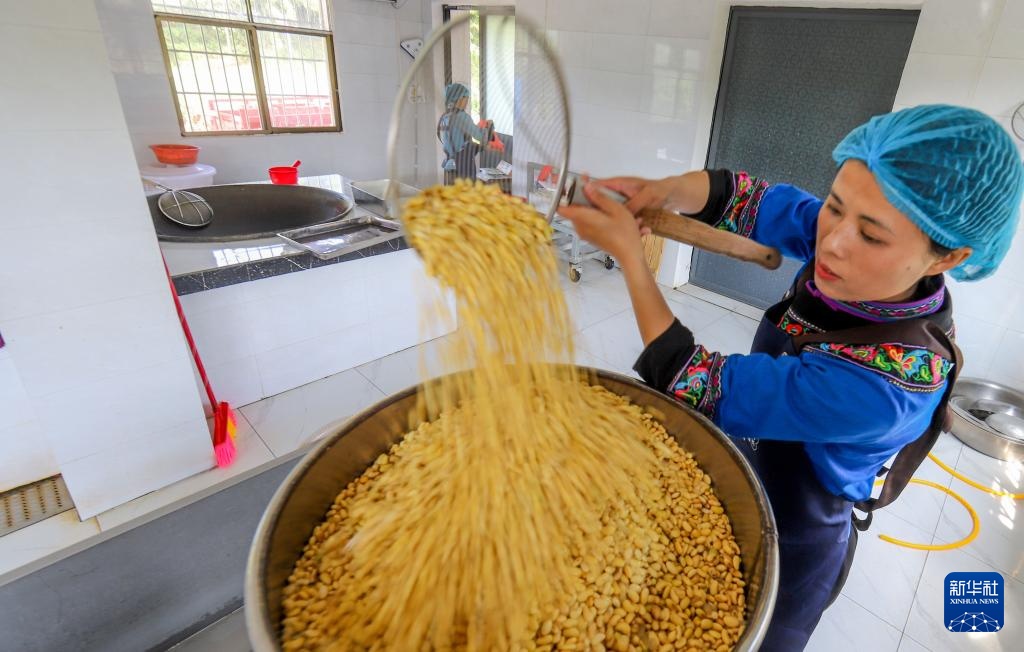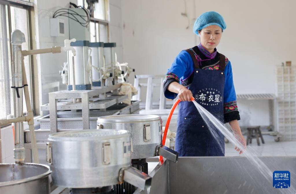 走进贵州省贵阳市乌当区偏坡布依族乡下院村的食品加工坊,“90后”返乡大学生陈星星和工人一起在制作、包装灰豆腐,赶制订单。