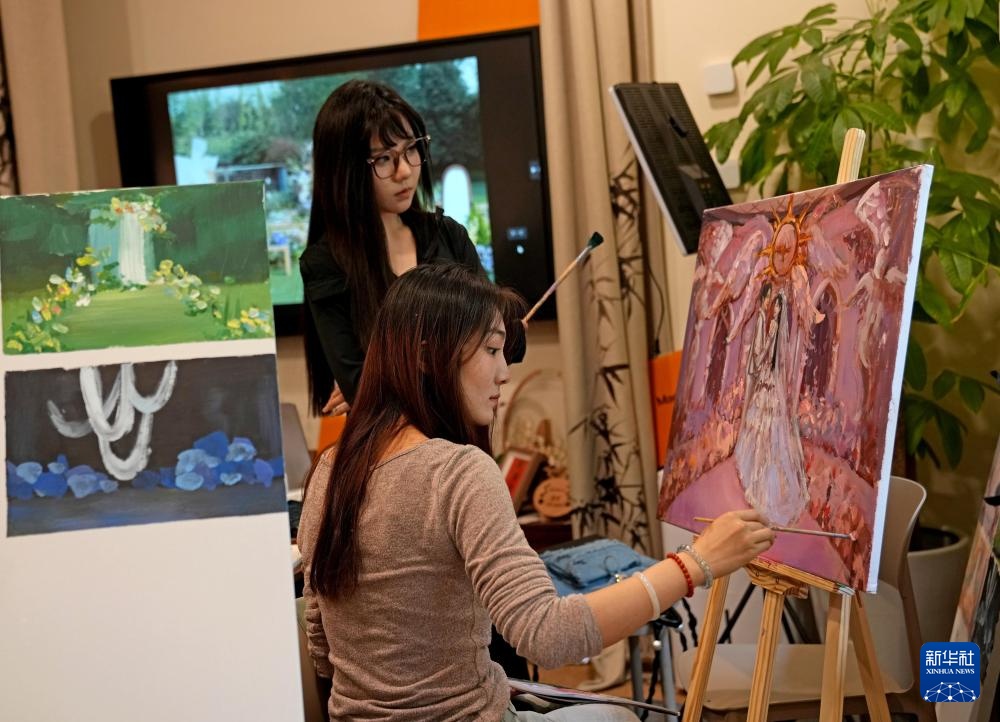 参与者在小店举办的“婚礼绘画师”主题活动中现场作画交流(4月26日摄)。