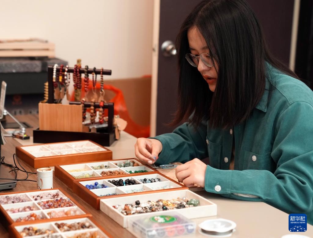 一名年轻女孩在小店里制作手串(4月26日摄)。