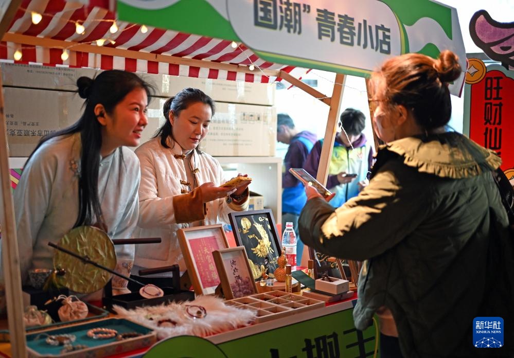 在共青团上海市委主办的“青春小店·探潮”展示活动上,司方方(左二)与李雯(左一)在宣传推介小店(3月12日摄)。