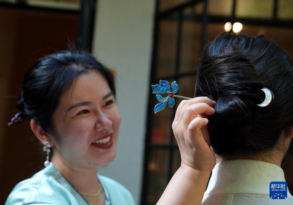 李雯帮小店的手作课程团队成员小福佩戴烧蓝头饰(4月18日摄)。