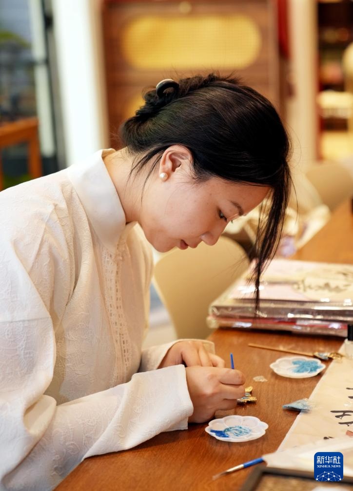小店的手作课程团队成员小福在制作烧蓝发饰(4月18日摄)。