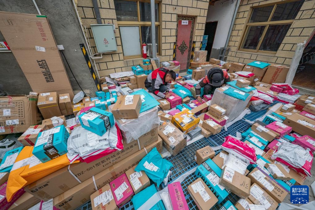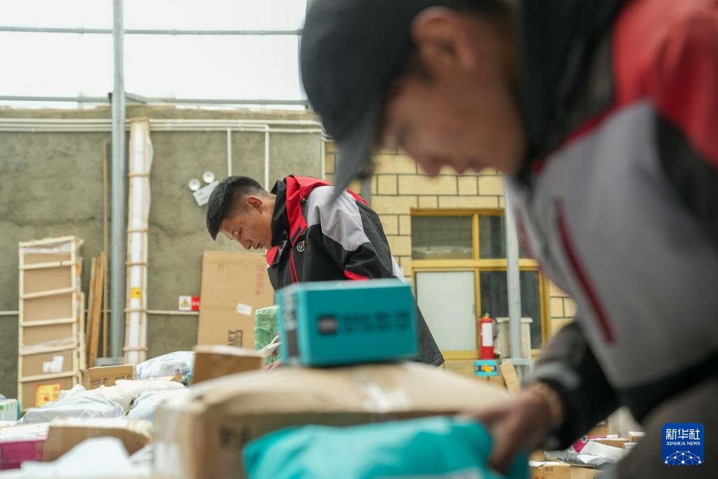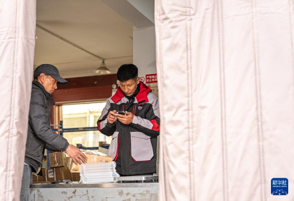 拉巴(左)在站点内查看快递信息(4月24日摄)。