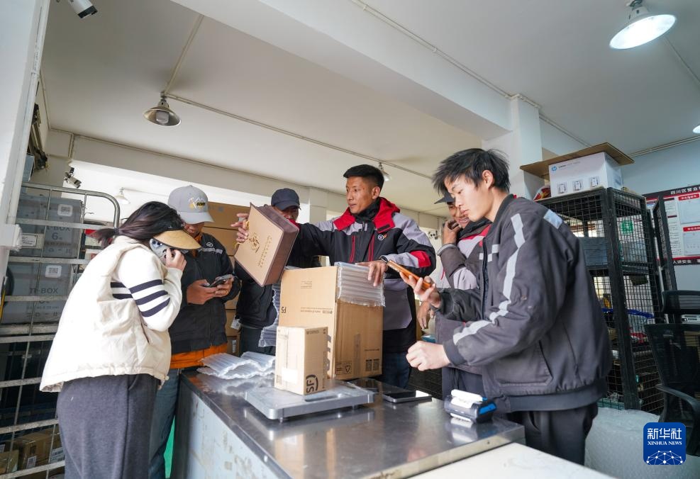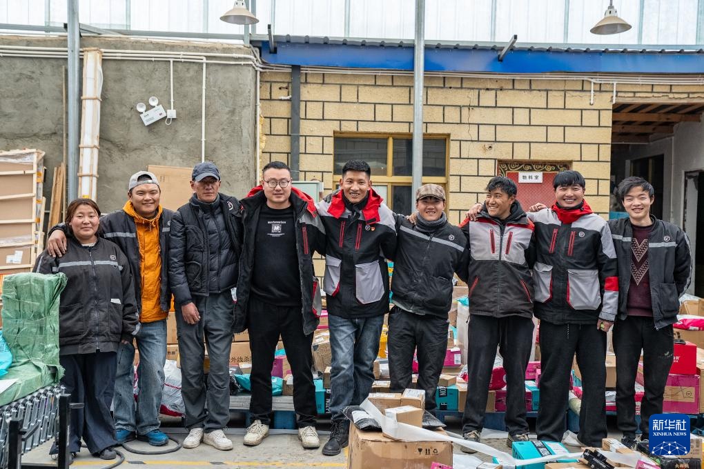 拉巴(左四)在站点内打包快递(4月24日摄)。