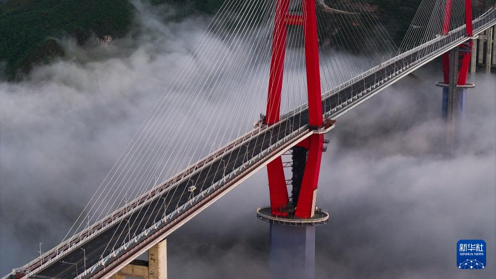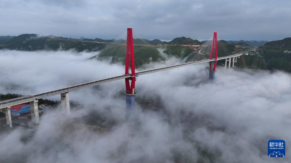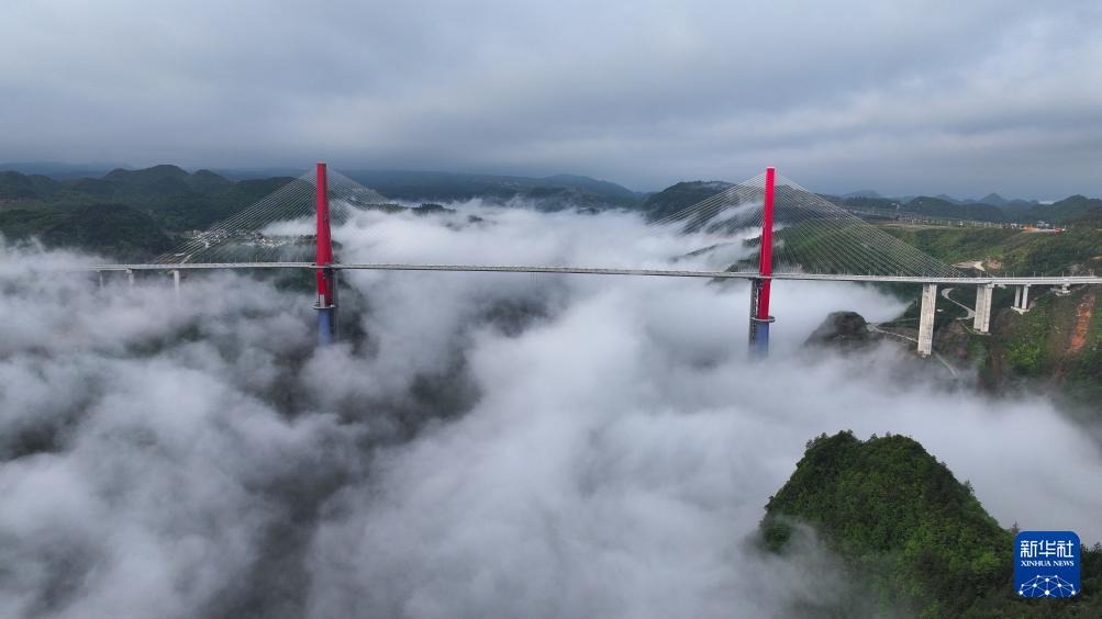 当日,一场春雨过后,贵州省龙里县的龙里河大桥周边出现云海景观,晨曦中的大桥仿佛飞架于云端之上,蔚为壮观。龙里河大桥全长1260米,主桥及塔柱设计有观光旅游玻璃栈道、全景观光电梯等旅游设施,是贵州探索“桥旅融合”打造的新“网红”景点。