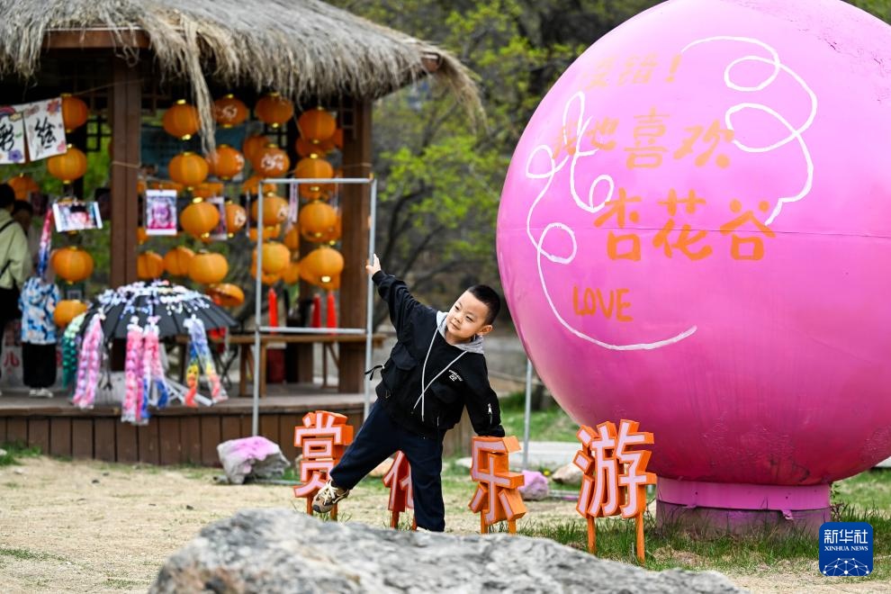 5月4日,小朋友在位于回民区东乌素图村的乌素图杏花谷景区拍照。