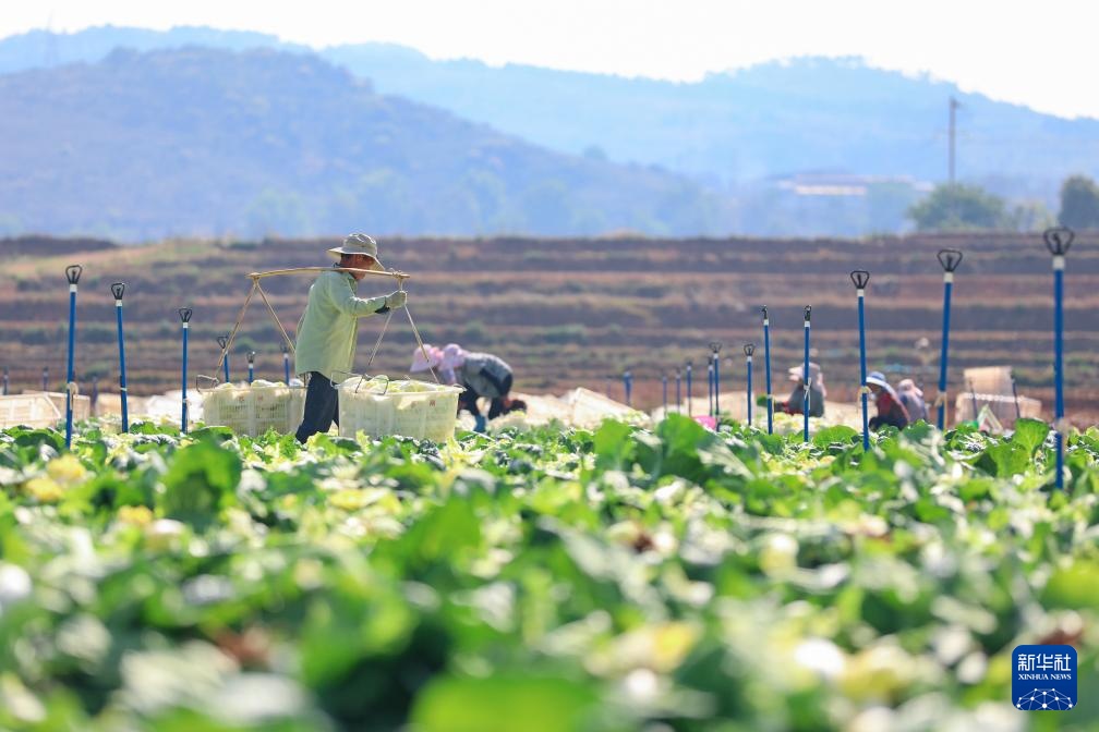 5月5日,在云南省曲靖市陆良县芳华镇龙潭社区露天蔬菜种植基地,菜农在采收新鲜蔬菜。