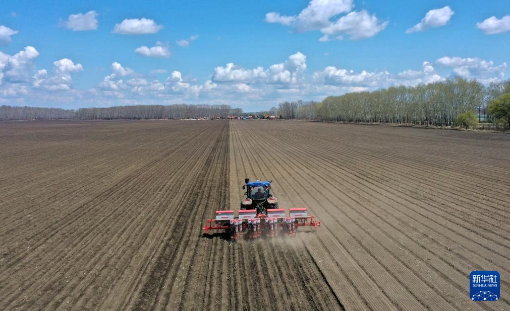5月5日,在位于黑龙江省双鸭山市的黑龙江北大荒农业股份有限公司友谊分公司第五管理区第一作业站,种植户在进行玉米播种作业(无人机照片)。