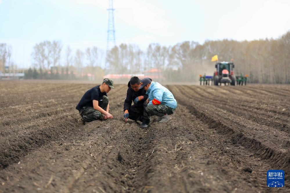 5月5日,在位于黑龙江省黑河市的北大荒集团黑龙江建设农场有限公司玉米播种地号,农业技术人员、种植户、家庭农场场长三方联合检查播种深度和株距。