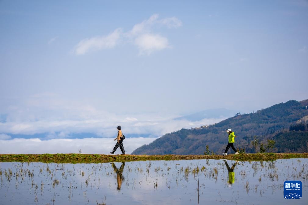 2月26日,游客在云南省元阳县阿者科村的梯田游览。