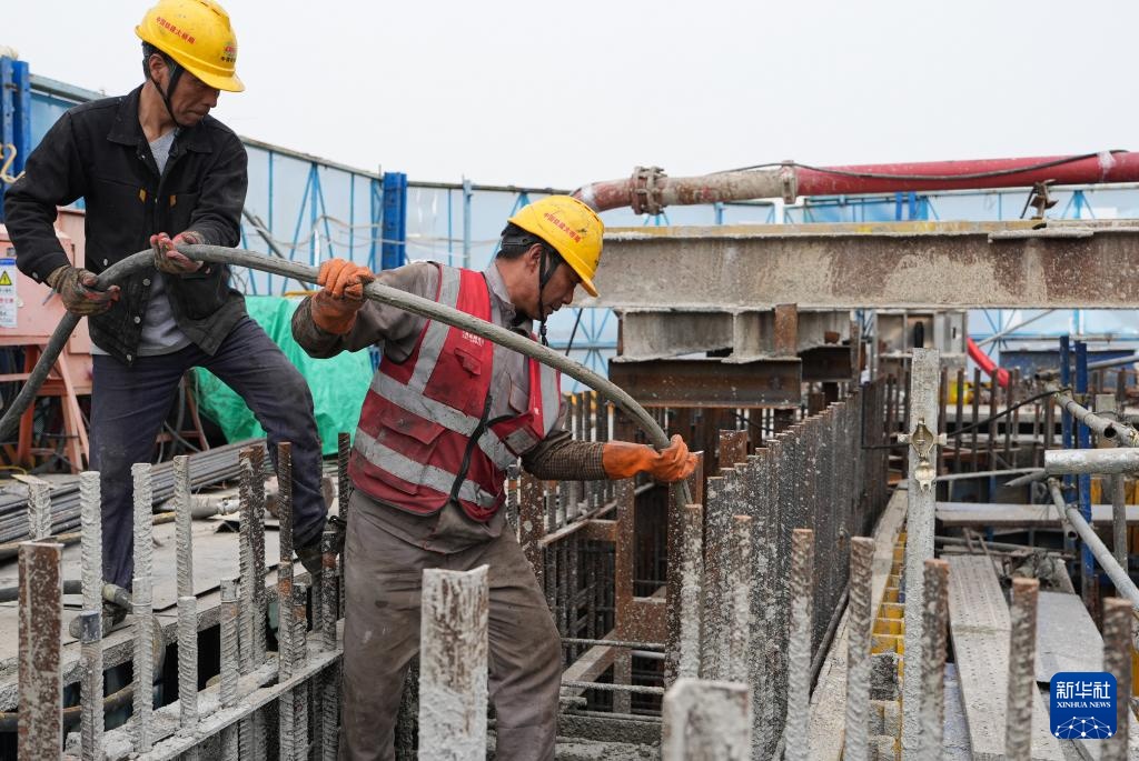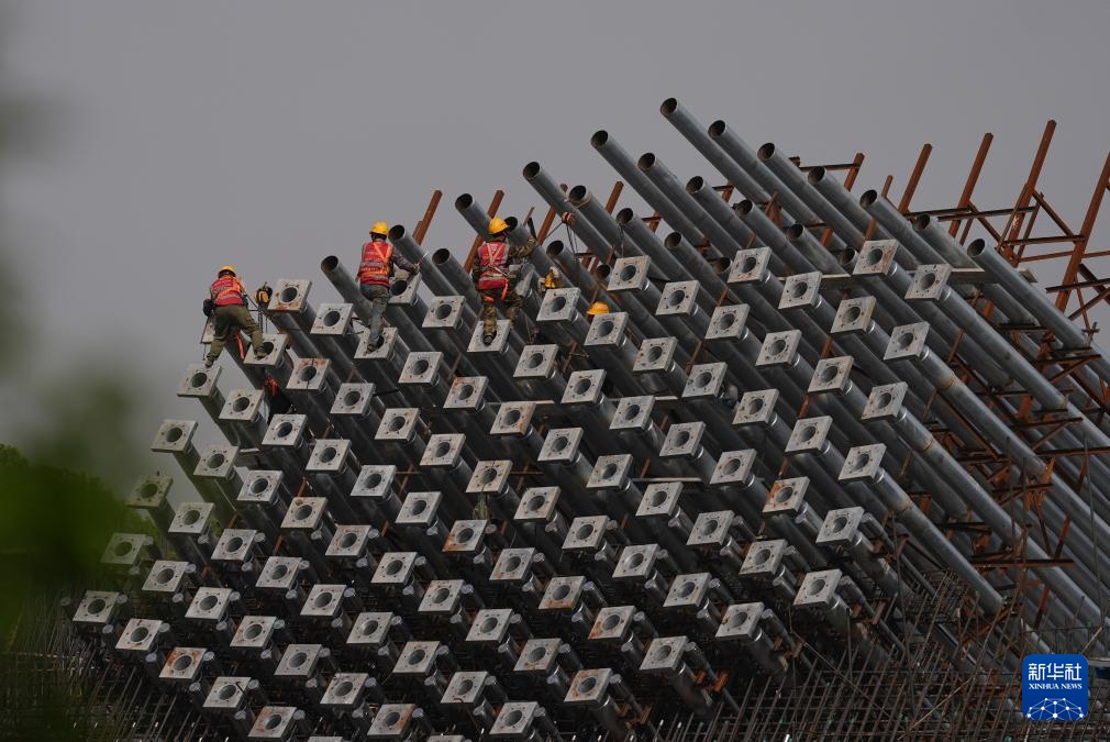 5月6日,中国铁建大桥局建设者在双屿门特大桥六横侧索塔高空平台施工。