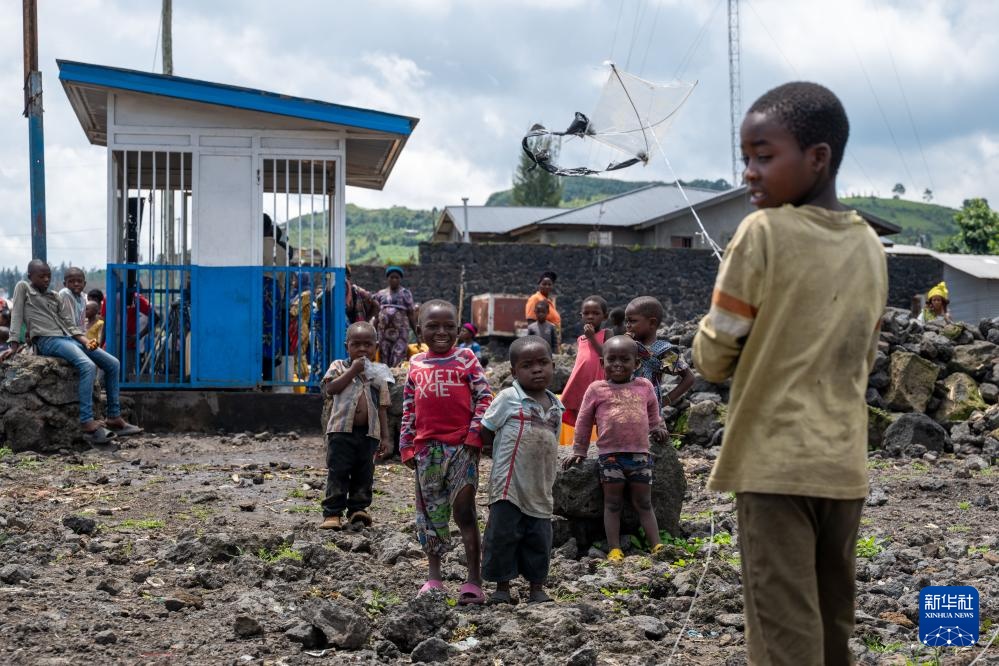 5月6日,在刚果(金)东部北基伍省戈马市郊,几名儿童在原营地附近的一处取水点玩耍。
