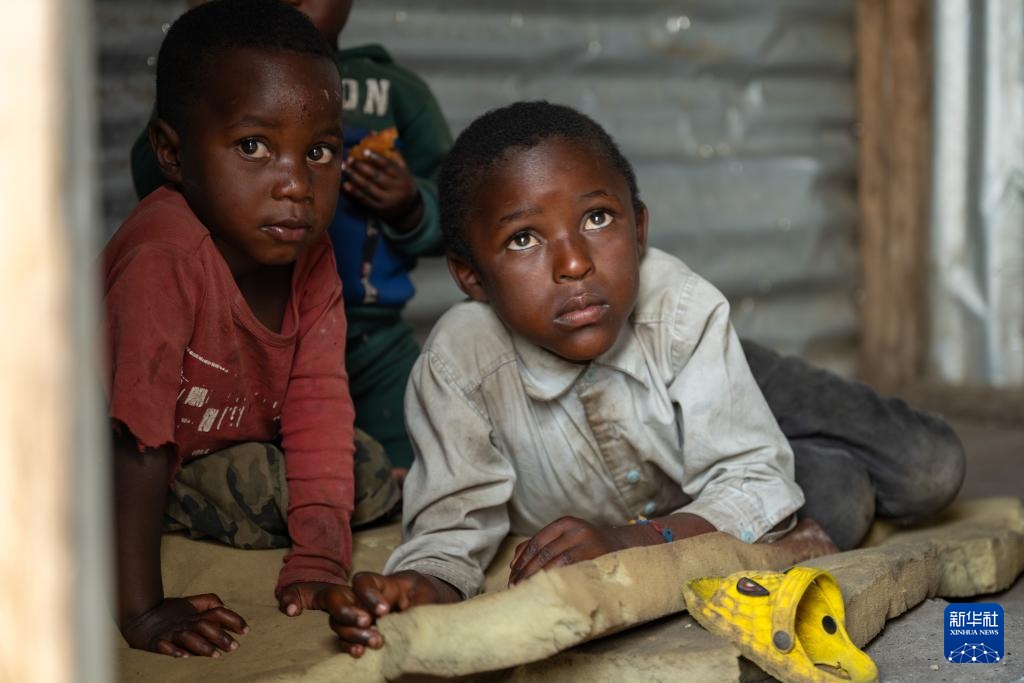 5月6日,在刚果(金)东部北基伍省戈马市郊,几名儿童在原营地附近的铁皮屋住所内休息。