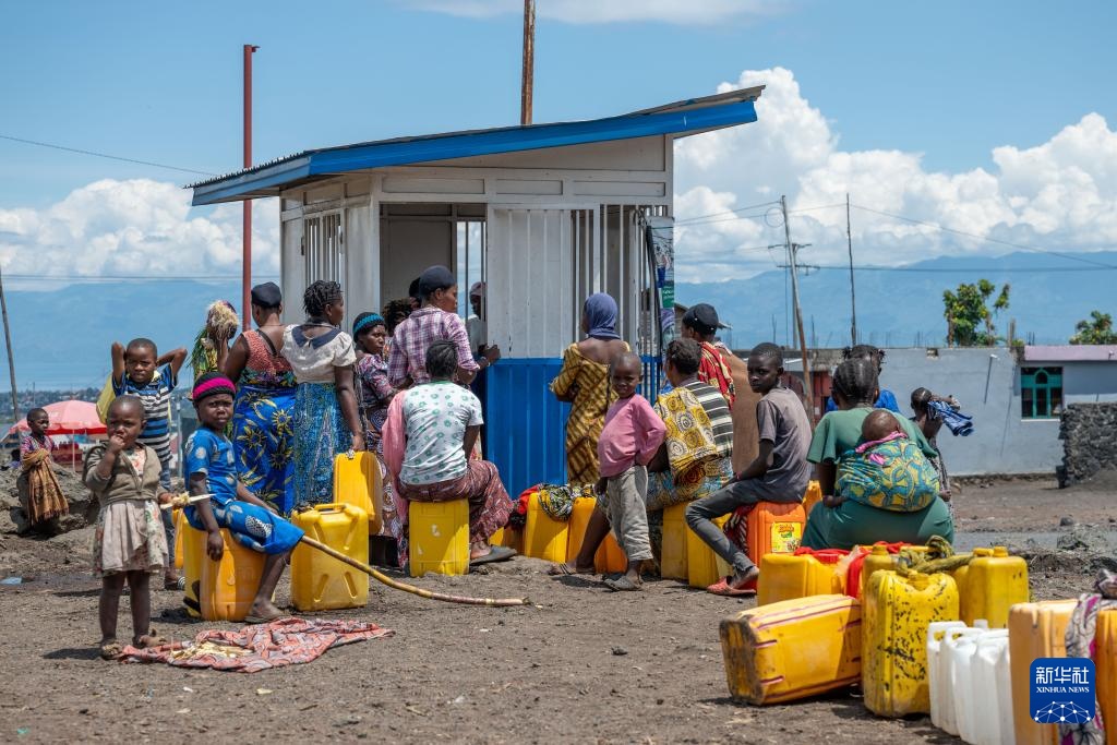 5月6日,在刚果(金)东部北基伍省戈马市郊,流离失所者来到原营地附近的一处取水点等待取水。