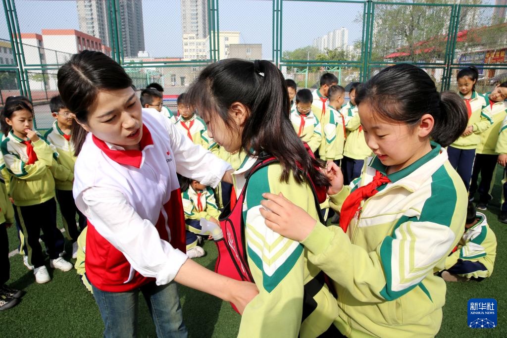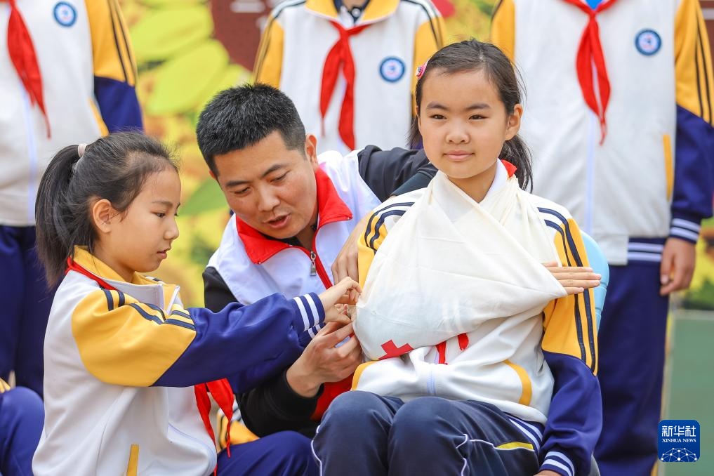 5月7日,山东省青岛市李沧区红十字会讲师在青岛汾阳路小学指导学生学习救护包扎技能。