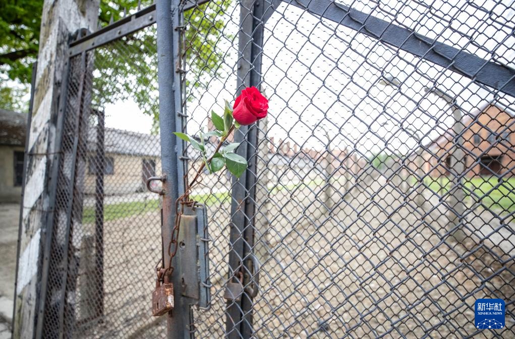 这是5月6日在波兰南部拍摄的奥斯维辛-比克瑙集中营旧址铁门上的鲜花。