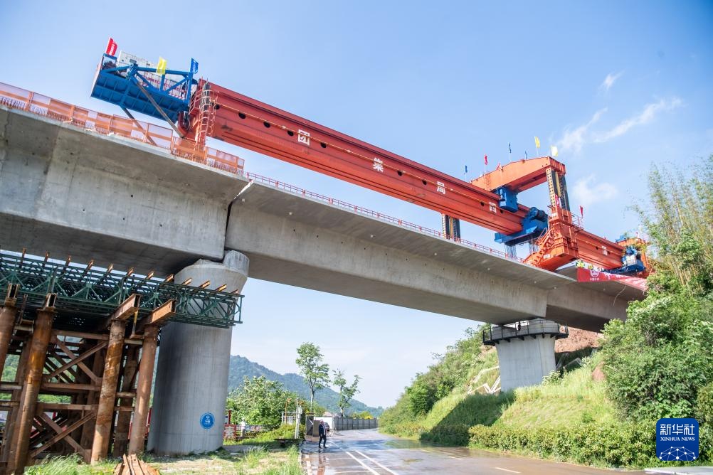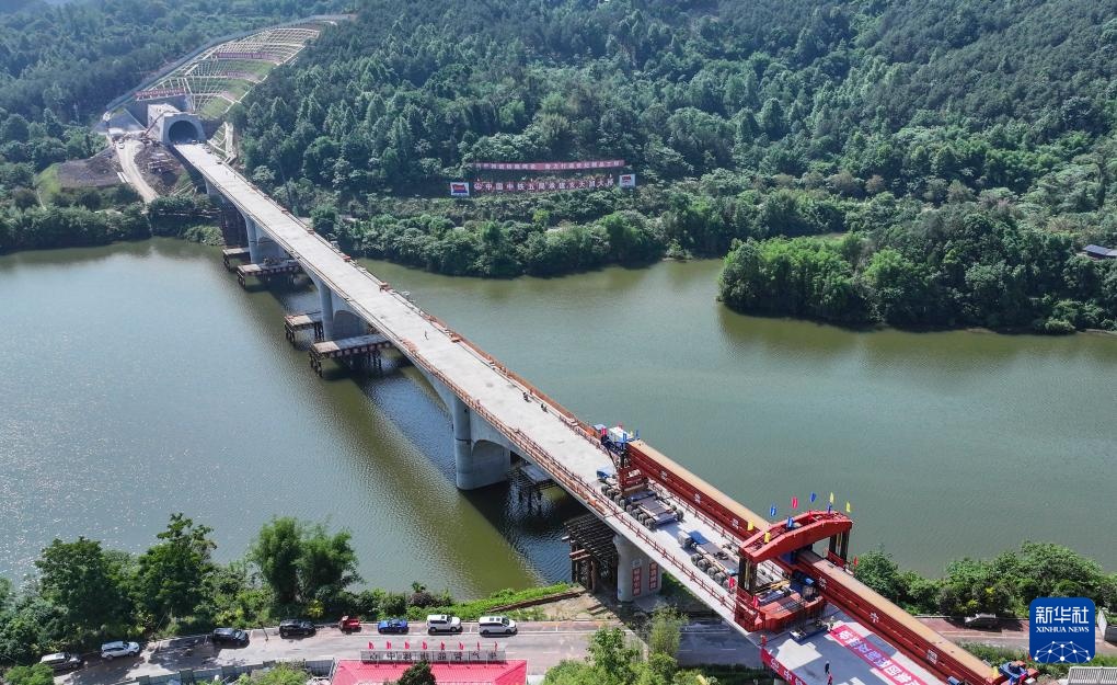 5月7日,在成渝中线高铁玄天湖双线大桥建设现场,架梁机在架设最后一孔箱梁。