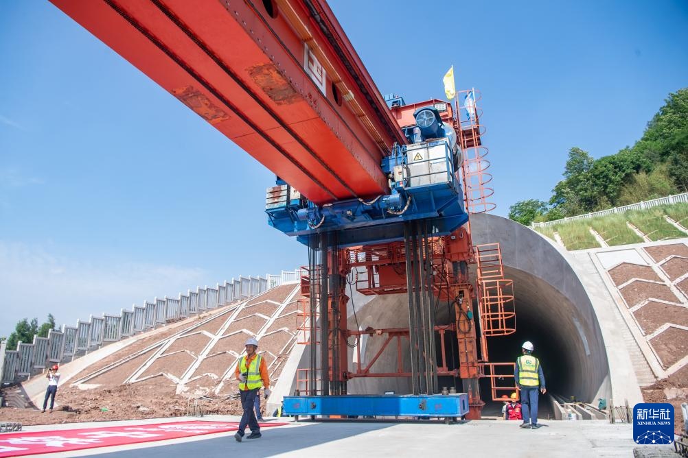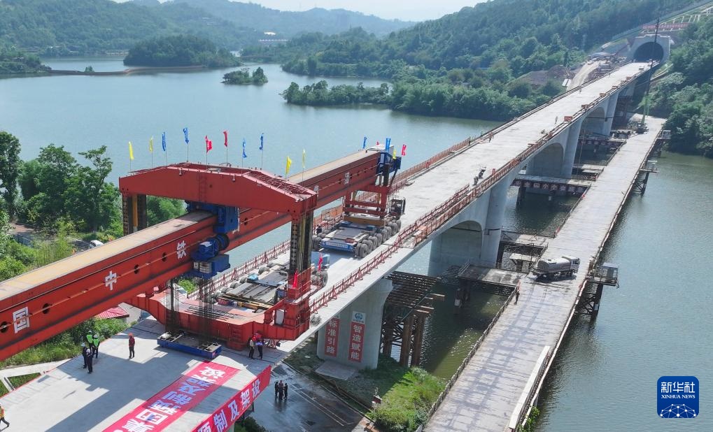 5月7日,在成渝中线高铁玄天湖双线大桥建设现场,工人在操作架梁机架设最后一孔箱梁。