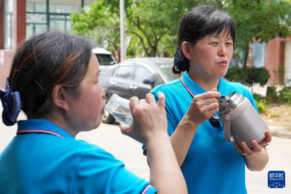 4月29日,王汝芳(右)和崔恒霞在工作间隙吃午饭,进行简单休息。