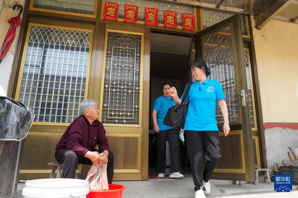 4月29日,王汝芳(右)和崔恒霞(中)在完成工作后与失能老人陈爷爷的老伴丁奶奶告别。