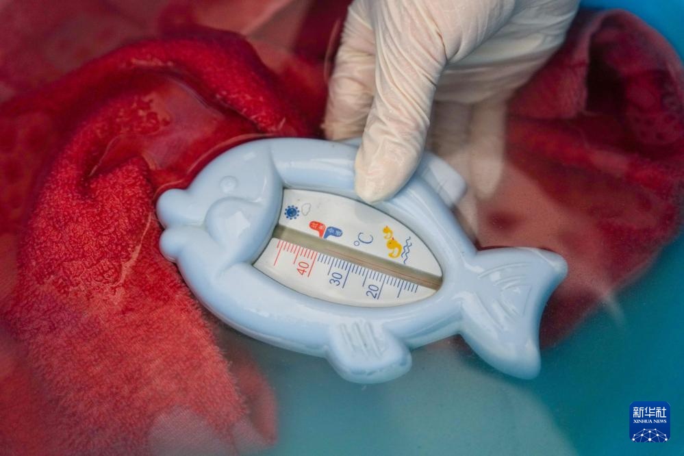 4月29日,王汝芳在工作中用温度计测量水温,确保使用温度适宜的水为失能老人清洗。