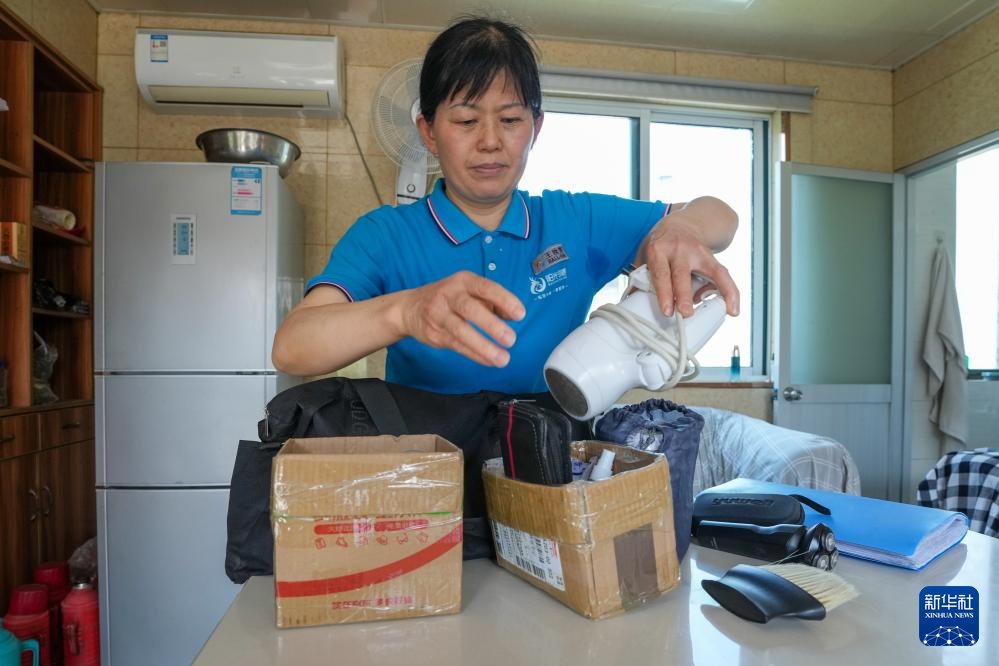 4月29日,王汝芳在开始照护工作前,在家中检查需要携带的护理工具。