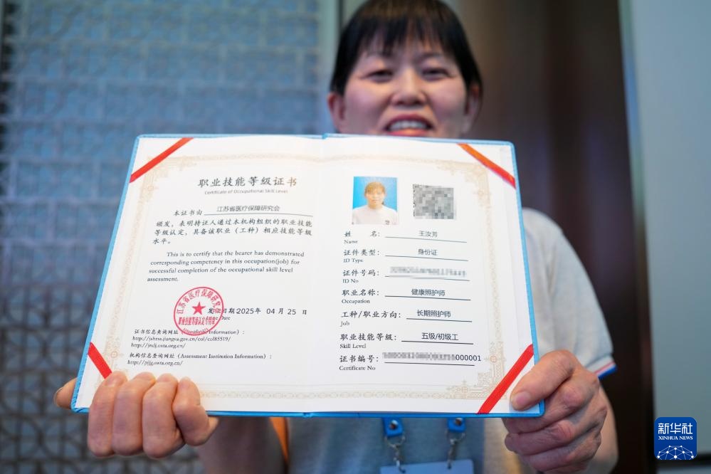 “学习考证的过程,让我掌握的技能更加全面,提供服务更有底气。”从洗发、穿脱衣物等生活照护,到测量血压、血糖等基础护理,再到识别噎食、误吸等应急处置……王汝芳通过了系统的学习培训,现在“持证上岗”。她说:“长期照护师证书是对我专业能力的认可,增强了我对未来职业发展的信心。我将以这份新职业为起点,用专业和爱心服务更多的失能人士和家庭,更好守护失能人士的生命尊严。”