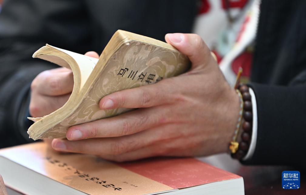 4月24日,在天津市东丽区金桥养老中心(马三立老人院),吴瑞龙翻看《马三立相声选》。