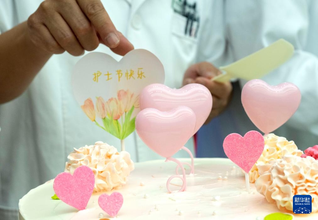 5月8日,在北京按摩医院(朝阳院区),医护人员在品尝蛋糕。