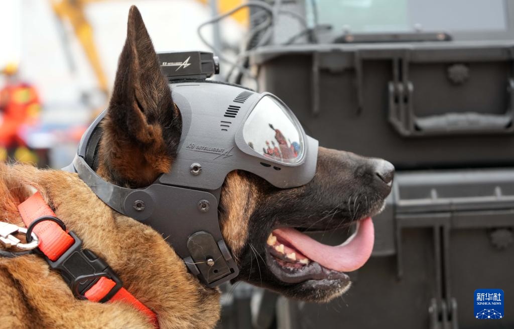 5月8日,中国救援山东搜救犬机动专业支队的搜救犬佩戴远程搜救系统参加演练。