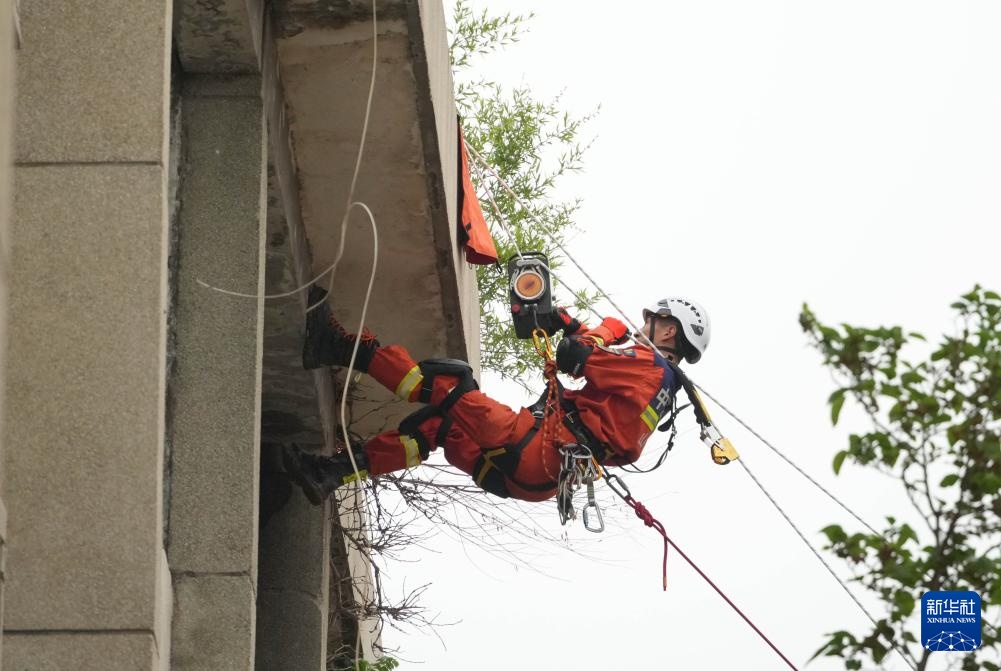 5月7日,地震救援队员在利用绳索系统进行演练。