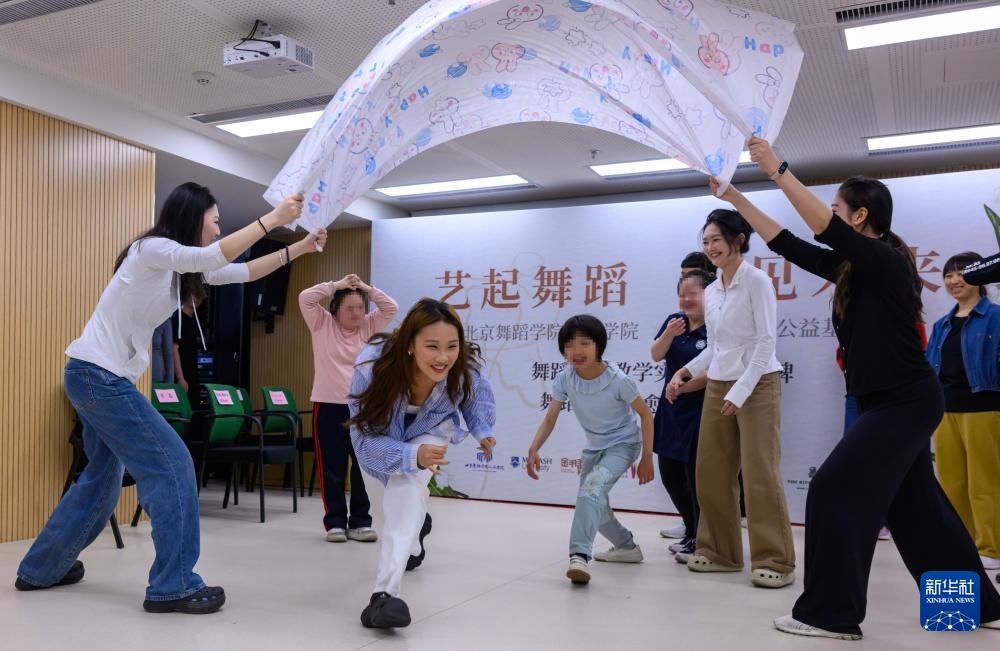 5月8日,北京舞蹈学院学生在活动现场与孤独症儿童一起游戏。