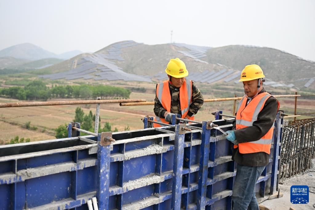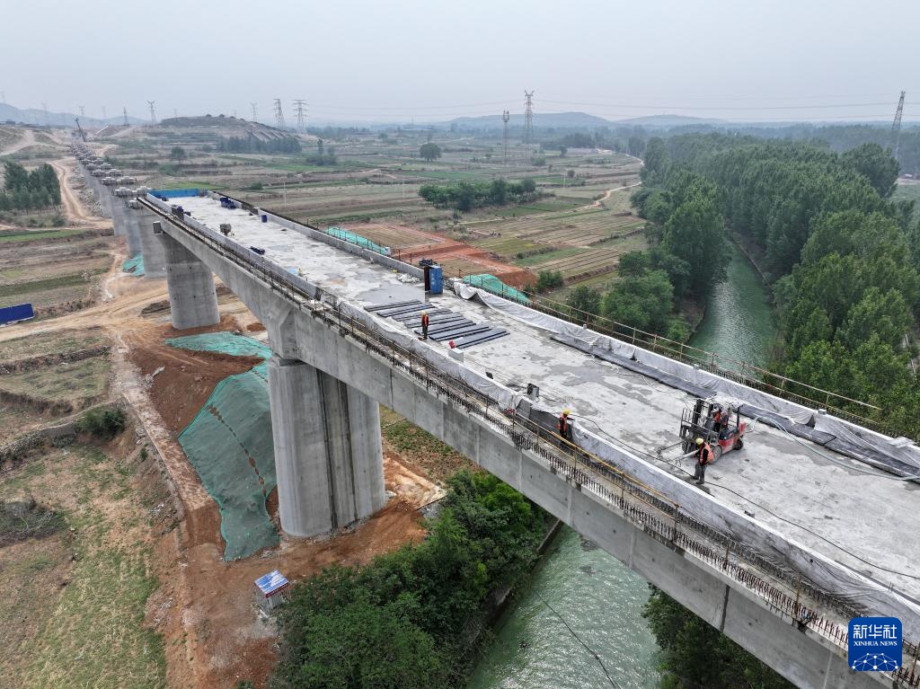 这是中铁十二局工人在雄忻高铁河北段站前3标段建设现场(5月8日摄,无人机照片)。