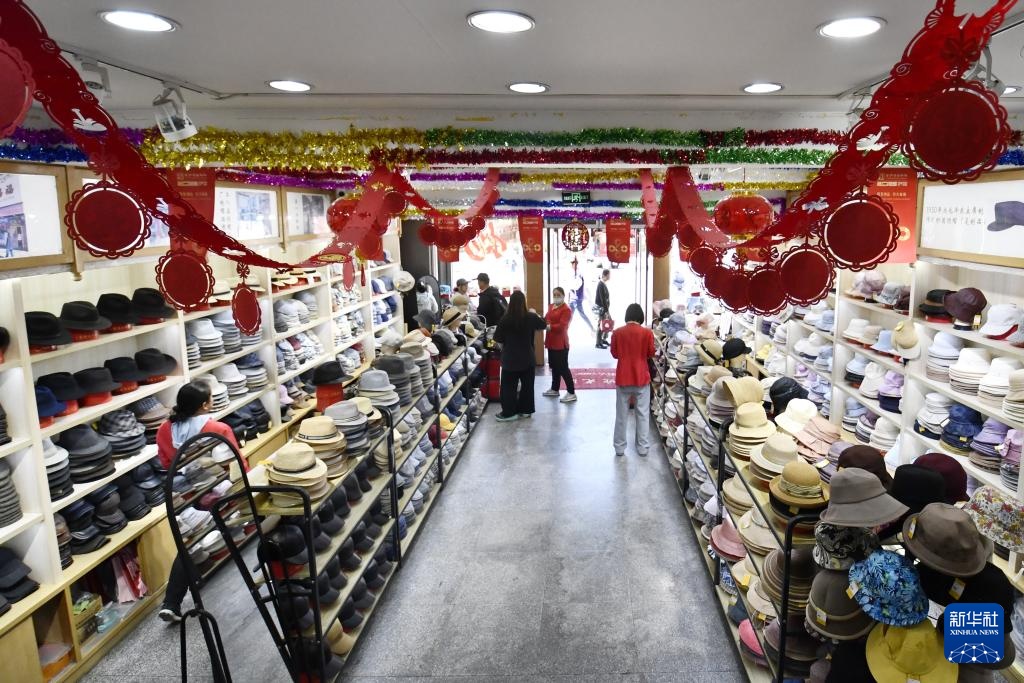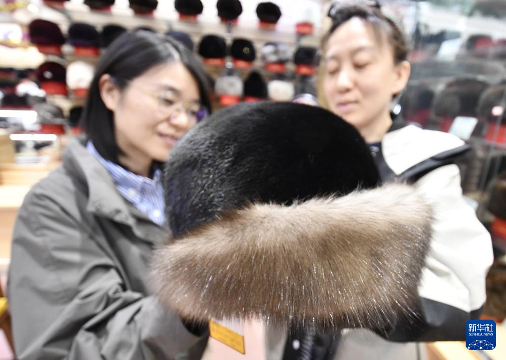 顾客在北京王府井商业街的盛锡福帽店内挑选皮帽(4月22日摄)。
