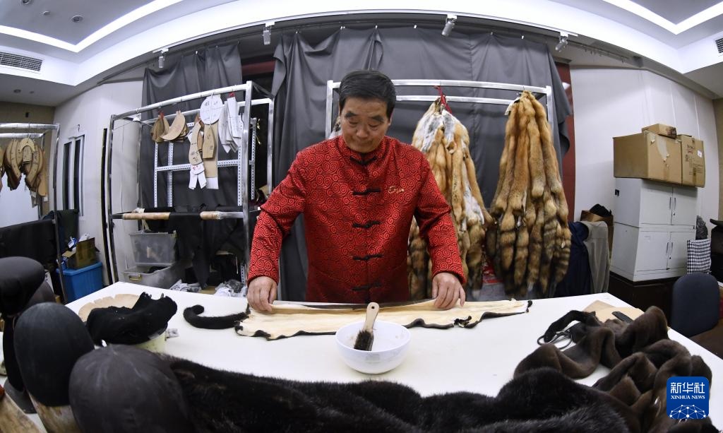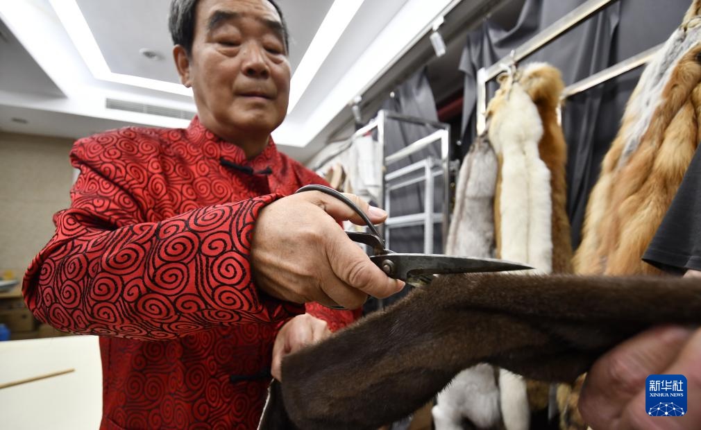 国家级非物质文化遗产盛锡福皮帽制作技艺代表性传承人、全国“五一”劳动奖章获得者李金善在裁制皮张(4月22日摄)。